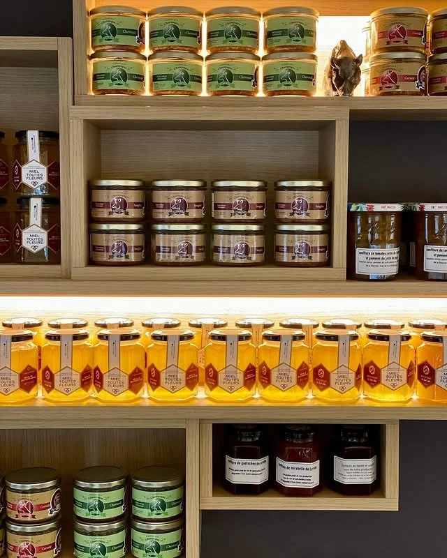 Choisissez dans la boutique : pâtés & terrines, confitures & marmelades, miel, bières locales…